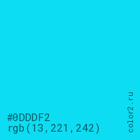 Цвет #0DDDF2 в цветовой модели RGB обозначается тремя октетами (13, 221, 242) в десятичном формате и #0DDDF2 в шестнадцатиричном (hex) формате, которые являются интенсивностью красного 13 (hex 0D), интенсивность зелёного 221 (hex DD) и интенсивность синего 242 (hex F2).