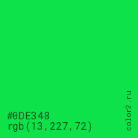 Цвет #0DE348 в цветовой модели RGB обозначается тремя октетами (13, 227, 72) в десятичном формате и #0DE348 в шестнадцатиричном (hex) формате, которые являются интенсивностью красного 13 (hex 0D), интенсивность зелёного 227 (hex E3) и интенсивность синего 72 (hex 48).