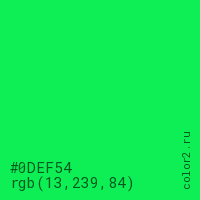Цвет #0DEF54 в цветовой модели RGB обозначается тремя октетами (13, 239, 84) в десятичном формате и #0DEF54 в шестнадцатиричном (hex) формате, которые являются интенсивностью красного 13 (hex 0D), интенсивность зелёного 239 (hex EF) и интенсивность синего 84 (hex 54).