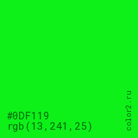 Цвет #0DF119 в цветовой модели RGB обозначается тремя октетами (13, 241, 25) в десятичном формате и #0DF119 в шестнадцатиричном (hex) формате, которые являются интенсивностью красного 13 (hex 0D), интенсивность зелёного 241 (hex F1) и интенсивность синего 25 (hex 19).