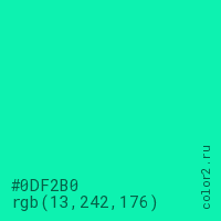 Цвет #0DF2B0 в цветовой модели RGB обозначается тремя октетами (13, 242, 176) в десятичном формате и #0DF2B0 в шестнадцатиричном (hex) формате, которые являются интенсивностью красного 13 (hex 0D), интенсивность зелёного 242 (hex F2) и интенсивность синего 176 (hex B0).
