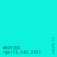 Цвет #0DF2DC в цветовой модели RGB обозначается тремя октетами (13, 242, 220) в десятичном формате и #0DF2DC в шестнадцатиричном (hex) формате, которые являются интенсивностью красного 13 (hex 0D), интенсивность зелёного 242 (hex F2) и интенсивность синего 220 (hex DC).