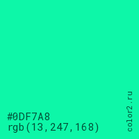 Цвет #0DF7A8 в цветовой модели RGB обозначается тремя октетами (13, 247, 168) в десятичном формате и #0DF7A8 в шестнадцатиричном (hex) формате, которые являются интенсивностью красного 13 (hex 0D), интенсивность зелёного 247 (hex F7) и интенсивность синего 168 (hex A8).