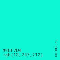 Цвет #0DF7D4 в цветовой модели RGB обозначается тремя октетами (13, 247, 212) в десятичном формате и #0DF7D4 в шестнадцатиричном (hex) формате, которые являются интенсивностью красного 13 (hex 0D), интенсивность зелёного 247 (hex F7) и интенсивность синего 212 (hex D4).