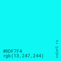 Цвет #0DF7F4 в цветовой модели RGB обозначается тремя октетами (13, 247, 244) в десятичном формате и #0DF7F4 в шестнадцатиричном (hex) формате, которые являются интенсивностью красного 13 (hex 0D), интенсивность зелёного 247 (hex F7) и интенсивность синего 244 (hex F4).