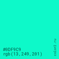 Цвет #0DF9C9 в цветовой модели RGB обозначается тремя октетами (13, 249, 201) в десятичном формате и #0DF9C9 в шестнадцатиричном (hex) формате, которые являются интенсивностью красного 13 (hex 0D), интенсивность зелёного 249 (hex F9) и интенсивность синего 201 (hex C9).
