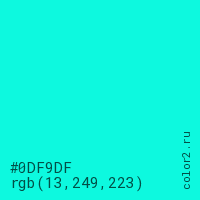 Цвет #0DF9DF в цветовой модели RGB обозначается тремя октетами (13, 249, 223) в десятичном формате и #0DF9DF в шестнадцатиричном (hex) формате, которые являются интенсивностью красного 13 (hex 0D), интенсивность зелёного 249 (hex F9) и интенсивность синего 223 (hex DF).