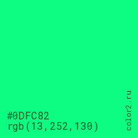 Цвет #0DFC82 в цветовой модели RGB обозначается тремя октетами (13, 252, 130) в десятичном формате и #0DFC82 в шестнадцатиричном (hex) формате, которые являются интенсивностью красного 13 (hex 0D), интенсивность зелёного 252 (hex FC) и интенсивность синего 130 (hex 82).