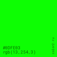 Цвет #0DFE03 в цветовой модели RGB обозначается тремя октетами (13, 254, 3) в десятичном формате и #0DFE03 в шестнадцатиричном (hex) формате, которые являются интенсивностью красного 13 (hex 0D), интенсивность зелёного 254 (hex FE) и интенсивность синего 3 (hex 03).