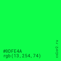 Цвет #0DFE4A в цветовой модели RGB обозначается тремя октетами (13, 254, 74) в десятичном формате и #0DFE4A в шестнадцатиричном (hex) формате, которые являются интенсивностью красного 13 (hex 0D), интенсивность зелёного 254 (hex FE) и интенсивность синего 74 (hex 4A).