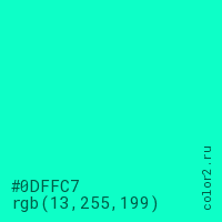 Цвет #0DFFC7 в цветовой модели RGB обозначается тремя октетами (13, 255, 199) в десятичном формате и #0DFFC7 в шестнадцатиричном (hex) формате, которые являются интенсивностью красного 13 (hex 0D), интенсивность зелёного 255 (hex FF) и интенсивность синего 199 (hex C7).