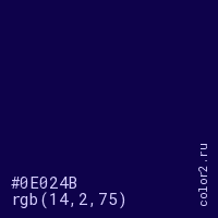 Цвет #0E024B в цветовой модели RGB обозначается тремя октетами (14, 2, 75) в десятичном формате и #0E024B в шестнадцатиричном (hex) формате, которые являются интенсивностью красного 14 (hex 0E), интенсивность зелёного 2 (hex 02) и интенсивность синего 75 (hex 4B).
