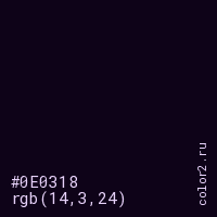 Цвет #0E0318 в цветовой модели RGB обозначается тремя октетами (14, 3, 24) в десятичном формате и #0E0318 в шестнадцатиричном (hex) формате, которые являются интенсивностью красного 14 (hex 0E), интенсивность зелёного 3 (hex 03) и интенсивность синего 24 (hex 18).