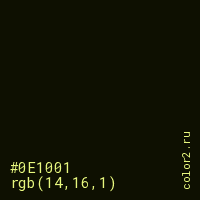 Цвет #0E1001 в цветовой модели RGB обозначается тремя октетами (14, 16, 1) в десятичном формате и #0E1001 в шестнадцатиричном (hex) формате, которые являются интенсивностью красного 14 (hex 0E), интенсивность зелёного 16 (hex 10) и интенсивность синего 1 (hex 01).