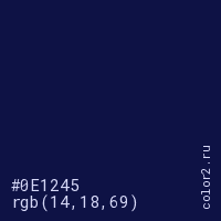 Цвет #0E1245 в цветовой модели RGB обозначается тремя октетами (14, 18, 69) в десятичном формате и #0E1245 в шестнадцатиричном (hex) формате, которые являются интенсивностью красного 14 (hex 0E), интенсивность зелёного 18 (hex 12) и интенсивность синего 69 (hex 45).