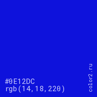 Цвет #0E12DC в цветовой модели RGB обозначается тремя октетами (14, 18, 220) в десятичном формате и #0E12DC в шестнадцатиричном (hex) формате, которые являются интенсивностью красного 14 (hex 0E), интенсивность зелёного 18 (hex 12) и интенсивность синего 220 (hex DC).