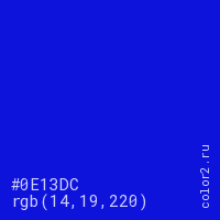 Цвет #0E13DC в цветовой модели RGB обозначается тремя октетами (14, 19, 220) в десятичном формате и #0E13DC в шестнадцатиричном (hex) формате, которые являются интенсивностью красного 14 (hex 0E), интенсивность зелёного 19 (hex 13) и интенсивность синего 220 (hex DC).