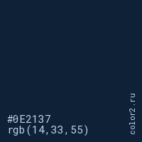 Цвет #0E2137 в цветовой модели RGB обозначается тремя октетами (14, 33, 55) в десятичном формате и #0E2137 в шестнадцатиричном (hex) формате, которые являются интенсивностью красного 14 (hex 0E), интенсивность зелёного 33 (hex 21) и интенсивность синего 55 (hex 37).