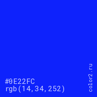 Цвет #0E22FC в цветовой модели RGB обозначается тремя октетами (14, 34, 252) в десятичном формате и #0E22FC в шестнадцатиричном (hex) формате, которые являются интенсивностью красного 14 (hex 0E), интенсивность зелёного 34 (hex 22) и интенсивность синего 252 (hex FC).