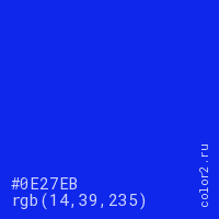 Цвет #0E27EB в цветовой модели RGB обозначается тремя октетами (14, 39, 235) в десятичном формате и #0E27EB в шестнадцатиричном (hex) формате, которые являются интенсивностью красного 14 (hex 0E), интенсивность зелёного 39 (hex 27) и интенсивность синего 235 (hex EB).