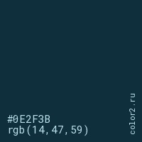 Цвет #0E2F3B в цветовой модели RGB обозначается тремя октетами (14, 47, 59) в десятичном формате и #0E2F3B в шестнадцатиричном (hex) формате, которые являются интенсивностью красного 14 (hex 0E), интенсивность зелёного 47 (hex 2F) и интенсивность синего 59 (hex 3B).