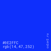 Цвет #0E2FFC в цветовой модели RGB обозначается тремя октетами (14, 47, 252) в десятичном формате и #0E2FFC в шестнадцатиричном (hex) формате, которые являются интенсивностью красного 14 (hex 0E), интенсивность зелёного 47 (hex 2F) и интенсивность синего 252 (hex FC).