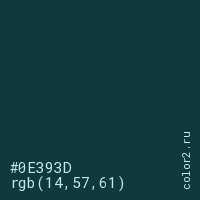 Цвет #0E393D в цветовой модели RGB обозначается тремя октетами (14, 57, 61) в десятичном формате и #0E393D в шестнадцатиричном (hex) формате, которые являются интенсивностью красного 14 (hex 0E), интенсивность зелёного 57 (hex 39) и интенсивность синего 61 (hex 3D).
