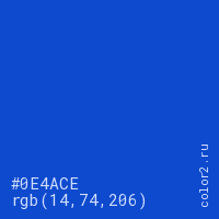 Цвет #0E4ACE в цветовой модели RGB обозначается тремя октетами (14, 74, 206) в десятичном формате и #0E4ACE в шестнадцатиричном (hex) формате, которые являются интенсивностью красного 14 (hex 0E), интенсивность зелёного 74 (hex 4A) и интенсивность синего 206 (hex CE).
