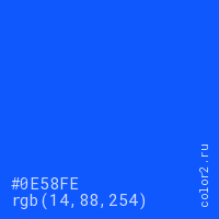 Цвет #0E58FE в цветовой модели RGB обозначается тремя октетами (14, 88, 254) в десятичном формате и #0E58FE в шестнадцатиричном (hex) формате, которые являются интенсивностью красного 14 (hex 0E), интенсивность зелёного 88 (hex 58) и интенсивность синего 254 (hex FE).