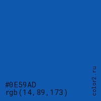 Цвет #0E59AD в цветовой модели RGB обозначается тремя октетами (14, 89, 173) в десятичном формате и #0E59AD в шестнадцатиричном (hex) формате, которые являются интенсивностью красного 14 (hex 0E), интенсивность зелёного 89 (hex 59) и интенсивность синего 173 (hex AD).
