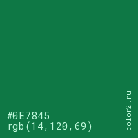 Цвет #0E7845 в цветовой модели RGB обозначается тремя октетами (14, 120, 69) в десятичном формате и #0E7845 в шестнадцатиричном (hex) формате, которые являются интенсивностью красного 14 (hex 0E), интенсивность зелёного 120 (hex 78) и интенсивность синего 69 (hex 45).