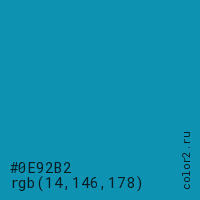 Цвет #0E92B2 в цветовой модели RGB обозначается тремя октетами (14, 146, 178) в десятичном формате и #0E92B2 в шестнадцатиричном (hex) формате, которые являются интенсивностью красного 14 (hex 0E), интенсивность зелёного 146 (hex 92) и интенсивность синего 178 (hex B2).