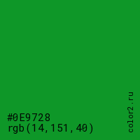 Цвет #0E9728 в цветовой модели RGB обозначается тремя октетами (14, 151, 40) в десятичном формате и #0E9728 в шестнадцатиричном (hex) формате, которые являются интенсивностью красного 14 (hex 0E), интенсивность зелёного 151 (hex 97) и интенсивность синего 40 (hex 28).