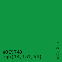 Цвет #0E9740 в цветовой модели RGB обозначается тремя октетами (14, 151, 64) в десятичном формате и #0E9740 в шестнадцатиричном (hex) формате, которые являются интенсивностью красного 14 (hex 0E), интенсивность зелёного 151 (hex 97) и интенсивность синего 64 (hex 40).