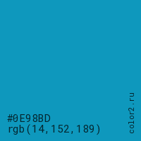 Цвет #0E98BD в цветовой модели RGB обозначается тремя октетами (14, 152, 189) в десятичном формате и #0E98BD в шестнадцатиричном (hex) формате, которые являются интенсивностью красного 14 (hex 0E), интенсивность зелёного 152 (hex 98) и интенсивность синего 189 (hex BD).