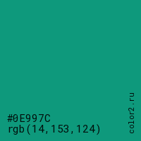 Цвет #0E997C в цветовой модели RGB обозначается тремя октетами (14, 153, 124) в десятичном формате и #0E997C в шестнадцатиричном (hex) формате, которые являются интенсивностью красного 14 (hex 0E), интенсивность зелёного 153 (hex 99) и интенсивность синего 124 (hex 7C).