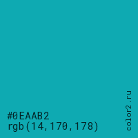 Цвет #0EAAB2 в цветовой модели RGB обозначается тремя октетами (14, 170, 178) в десятичном формате и #0EAAB2 в шестнадцатиричном (hex) формате, которые являются интенсивностью красного 14 (hex 0E), интенсивность зелёного 170 (hex AA) и интенсивность синего 178 (hex B2).