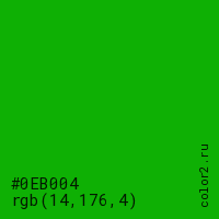 Цвет #0EB004 в цветовой модели RGB обозначается тремя октетами (14, 176, 4) в десятичном формате и #0EB004 в шестнадцатиричном (hex) формате, которые являются интенсивностью красного 14 (hex 0E), интенсивность зелёного 176 (hex B0) и интенсивность синего 4 (hex 04).