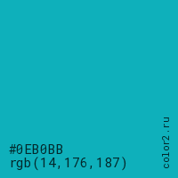 Цвет #0EB0BB в цветовой модели RGB обозначается тремя октетами (14, 176, 187) в десятичном формате и #0EB0BB в шестнадцатиричном (hex) формате, которые являются интенсивностью красного 14 (hex 0E), интенсивность зелёного 176 (hex B0) и интенсивность синего 187 (hex BB).