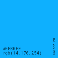 Цвет #0EB0FE в цветовой модели RGB обозначается тремя октетами (14, 176, 254) в десятичном формате и #0EB0FE в шестнадцатиричном (hex) формате, которые являются интенсивностью красного 14 (hex 0E), интенсивность зелёного 176 (hex B0) и интенсивность синего 254 (hex FE).