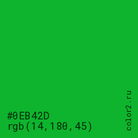 Цвет #0EB42D в цветовой модели RGB обозначается тремя октетами (14, 180, 45) в десятичном формате и #0EB42D в шестнадцатиричном (hex) формате, которые являются интенсивностью красного 14 (hex 0E), интенсивность зелёного 180 (hex B4) и интенсивность синего 45 (hex 2D).