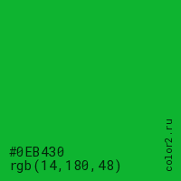 Цвет #0EB430 в цветовой модели RGB обозначается тремя октетами (14, 180, 48) в десятичном формате и #0EB430 в шестнадцатиричном (hex) формате, которые являются интенсивностью красного 14 (hex 0E), интенсивность зелёного 180 (hex B4) и интенсивность синего 48 (hex 30).