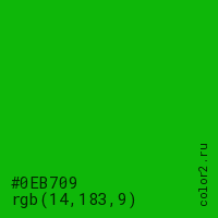Цвет #0EB709 в цветовой модели RGB обозначается тремя октетами (14, 183, 9) в десятичном формате и #0EB709 в шестнадцатиричном (hex) формате, которые являются интенсивностью красного 14 (hex 0E), интенсивность зелёного 183 (hex B7) и интенсивность синего 9 (hex 09).
