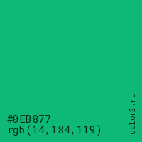 Цвет #0EB877 в цветовой модели RGB обозначается тремя октетами (14, 184, 119) в десятичном формате и #0EB877 в шестнадцатиричном (hex) формате, которые являются интенсивностью красного 14 (hex 0E), интенсивность зелёного 184 (hex B8) и интенсивность синего 119 (hex 77).
