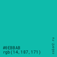 Цвет #0EBBAB в цветовой модели RGB обозначается тремя октетами (14, 187, 171) в десятичном формате и #0EBBAB в шестнадцатиричном (hex) формате, которые являются интенсивностью красного 14 (hex 0E), интенсивность зелёного 187 (hex BB) и интенсивность синего 171 (hex AB).