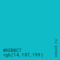 Цвет #0EBBC7 в цветовой модели RGB обозначается тремя октетами (14, 187, 199) в десятичном формате и #0EBBC7 в шестнадцатиричном (hex) формате, которые являются интенсивностью красного 14 (hex 0E), интенсивность зелёного 187 (hex BB) и интенсивность синего 199 (hex C7).