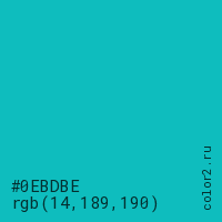 Цвет #0EBDBE в цветовой модели RGB обозначается тремя октетами (14, 189, 190) в десятичном формате и #0EBDBE в шестнадцатиричном (hex) формате, которые являются интенсивностью красного 14 (hex 0E), интенсивность зелёного 189 (hex BD) и интенсивность синего 190 (hex BE).