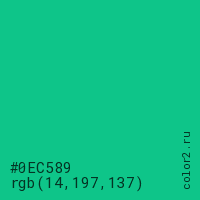 Цвет #0EC589 в цветовой модели RGB обозначается тремя октетами (14, 197, 137) в десятичном формате и #0EC589 в шестнадцатиричном (hex) формате, которые являются интенсивностью красного 14 (hex 0E), интенсивность зелёного 197 (hex C5) и интенсивность синего 137 (hex 89).