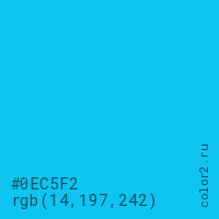 Цвет #0EC5F2 в цветовой модели RGB обозначается тремя октетами (14, 197, 242) в десятичном формате и #0EC5F2 в шестнадцатиричном (hex) формате, которые являются интенсивностью красного 14 (hex 0E), интенсивность зелёного 197 (hex C5) и интенсивность синего 242 (hex F2).