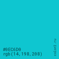 Цвет #0EC6D0 в цветовой модели RGB обозначается тремя октетами (14, 198, 208) в десятичном формате и #0EC6D0 в шестнадцатиричном (hex) формате, которые являются интенсивностью красного 14 (hex 0E), интенсивность зелёного 198 (hex C6) и интенсивность синего 208 (hex D0).